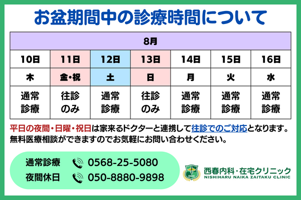 西春内科・在宅クリニックは、お盆期間中もやっております!