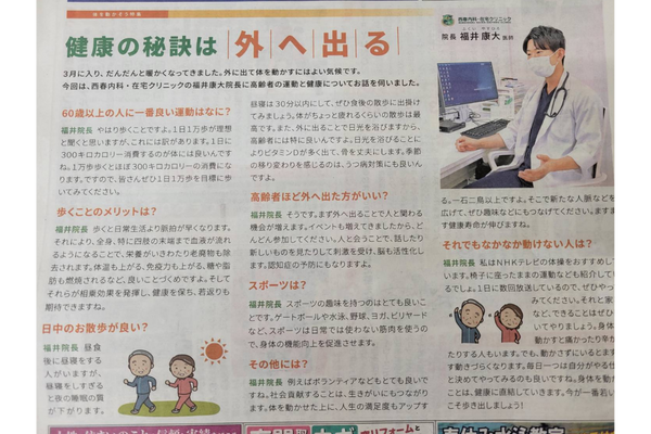 北名古屋市民タイムズに掲載されました 2023.3.10 北名古屋市民タイムズ(3月10日発行)に当院の特集ページが掲載されました。院長 福井先生が『健康で過ごすための秘訣』をお話させていただきました。FAQ形式で、詳しくお話しているので、お時間あればご一読ください。今後とも宜しくお願い致します。